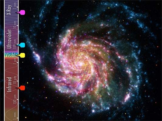 Caption: This image of M101 combines images from four different telescopes, each detecting a different part of the spectrum. Red indicates infrared information from Spitzer’s 24-micron detector, and shows the cool dust in the galaxy. Yellow shows the visible starlight from the Hubble telescope. Cyan is ultraviolet light from the Galaxy Evolution Explorer space telescope, which shows the hottest and youngest stars. And magenta is X-ray energy detected by the Chandra X-ray Observatory, indicating incredibly hot activity, like accretion around black holes.