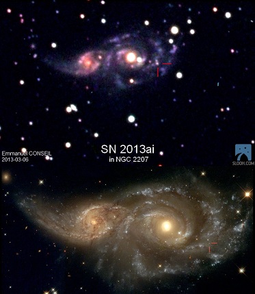 Caption: SN 2013ai, via its discoverer, Emmanuel Conseil, taken with the Slooh.com robotic telescope just a few days after its emergence in NGC 2207 (top); NASA, ESA and the Hubble Heritage Team (STScI) of the same interacting galaxies prior to the supernova (bottom).