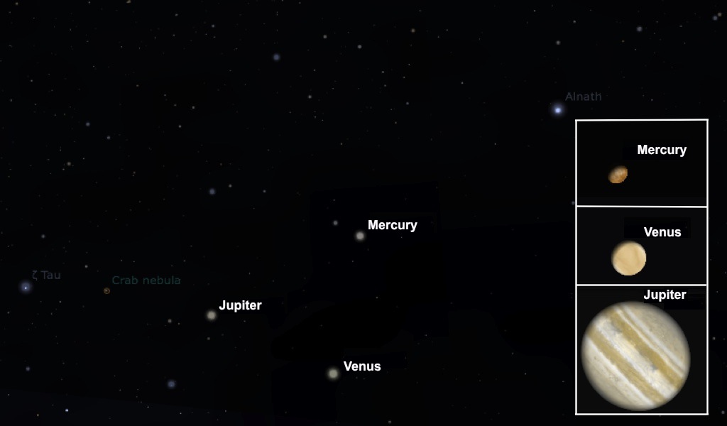 Caption: The image shows the configuration of Mercury, Venus, and Jupiter in the western sky just after sunset on May 26, 2013. Insets show the relative size appearance of the planets on that date.