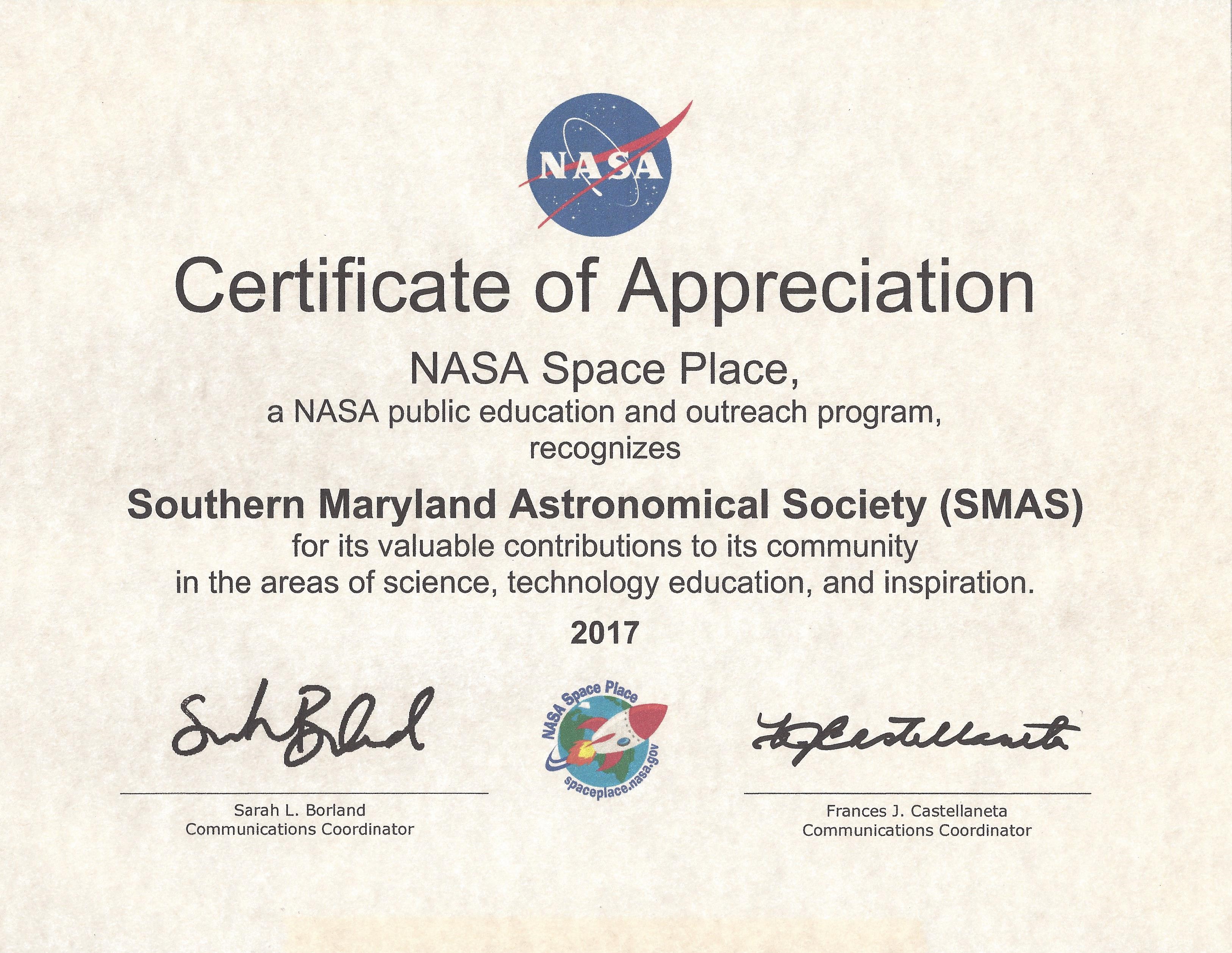 SMAS was honored by NASA Space Place for its outstanding community outreach programs.